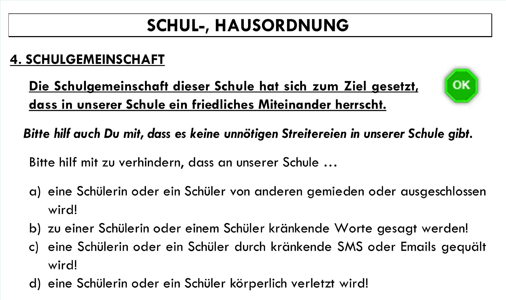Die Schulgemeinschaft dieser Schule hat sich zum Ziel gesetzt, mitzuhelfen, dass in unserer Schule ein friedliches Miteinander herrscht.